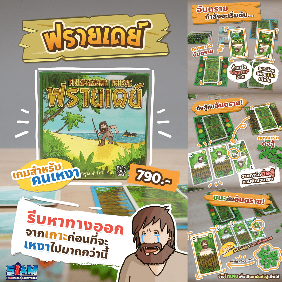 ฟรายเดย์ บอร์ดเกมสำหรับคนเหงา เมื่อวันนึงอยู่ดีๆโรบินสันก็ลอยมาเกยตื้นบนเกาะที่คุณอยู่ซะงั้น คุณต้องพยายามช่วยเขาเอาชีวิตรอดในเกาะร้าง เอาชนะสถานการณ์อันตรายต่างๆ เพื่อให้มีประสบการณ์มากขึ้นและส่งตัวเขาออกจากเกาะนี้ให้ได้ คุณจะได้อยู่บนเกาะนี้คนเดียวอย่างมีความสุข…