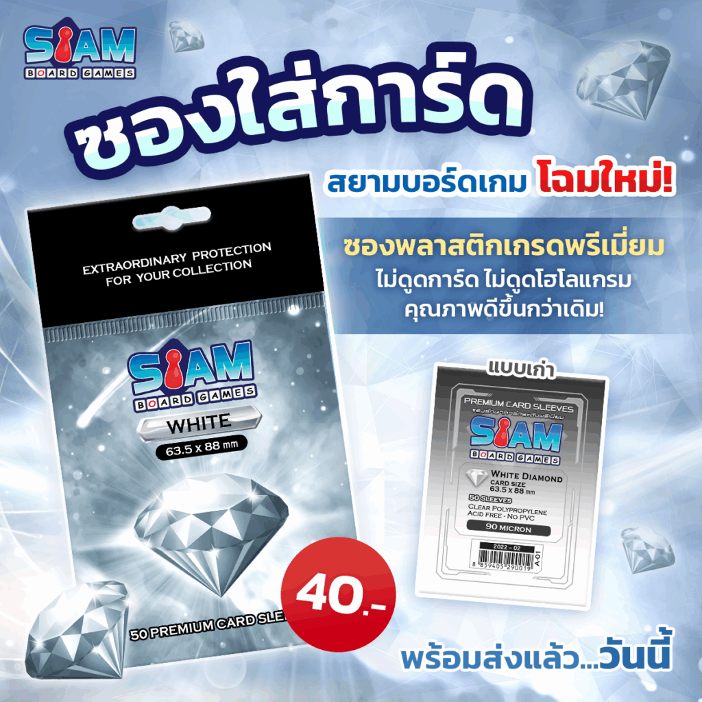 สยามบอร์ดเกมขอนำเสนอ White Premium Card Sleeve (90 micron) ขนาด 63.5 x 88 mm ปกป้องการ์ดของคุณด้วยซองการ์ดที่ผลิตจากพลาสติกเกรดพรีเมี่ยม ครั้งนี้มาพร้อมแพคเกจโฉมใหม่ พร้อมคุณภาพที่ดีกว่าเดิม! เนื้อซองเหนียวขึ้น ทั้งยังมีเนื้อสัมผัสที่ดีกว่าเดิม 💥ราคาเพียง 40.- บาทเท่านั้น💥