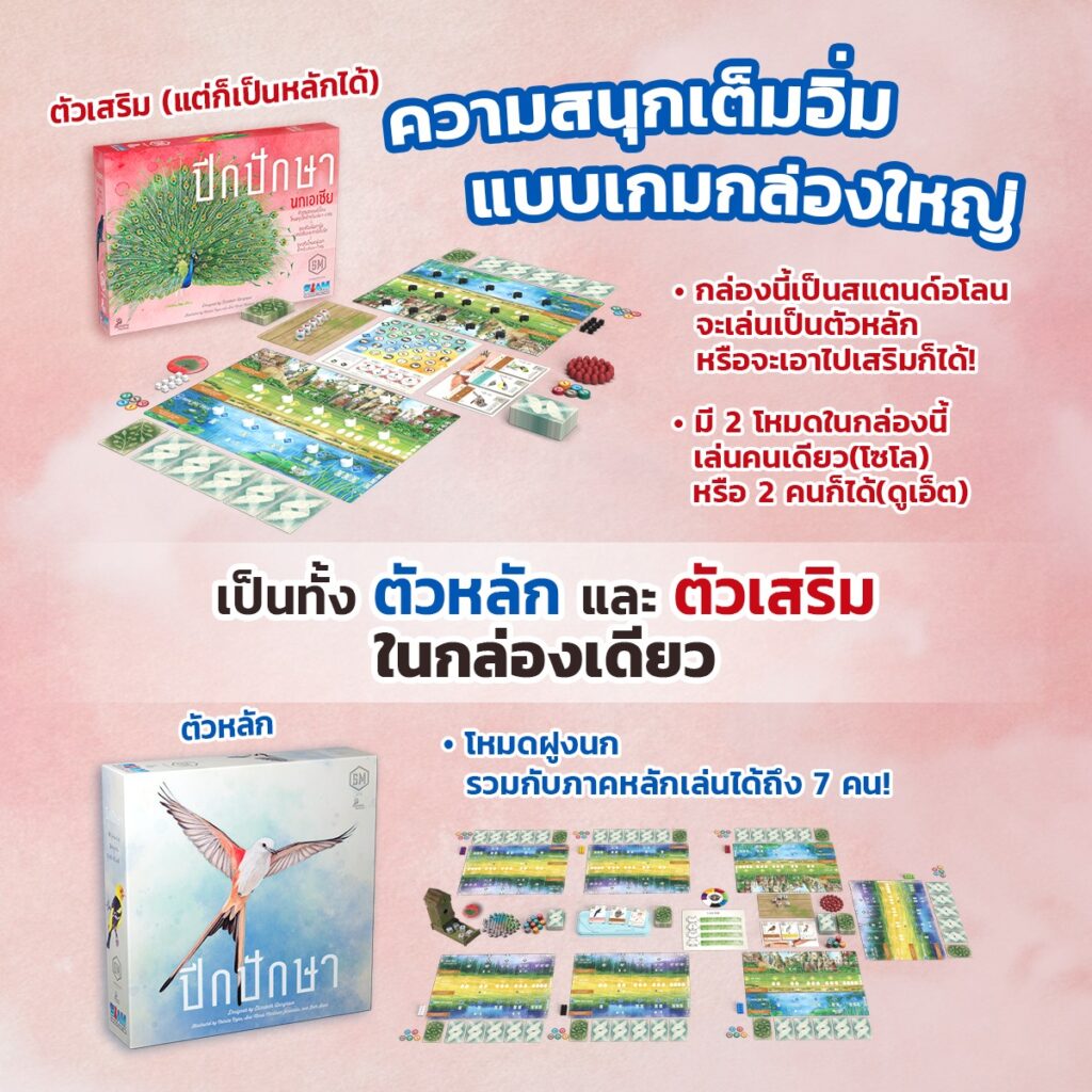 จากกล่องใหญ่ บอร์ดเกม ปีกปักษา มาเป็น ปีกปักษา นกเอเชีย ความสนุกเทียบเท่ากล่องใหญ่ เพราะนี้เล่นได้ทั้งเป็นภาคหลัก และภาคเสริมในกล่องเดียวกัน โดยจะมีทั้งโหมดโซโล สำหรับการเล่นคนเดียว โหมกดูเอ็ต สำหรับการเล่นแบบ 2 คน และสามารถนำไปเล่นรวมกับภาคหลักปีกปักษา เพื่อเพิ่มผู้เล่นให้ได้มากถึง 6-7 คนเลย