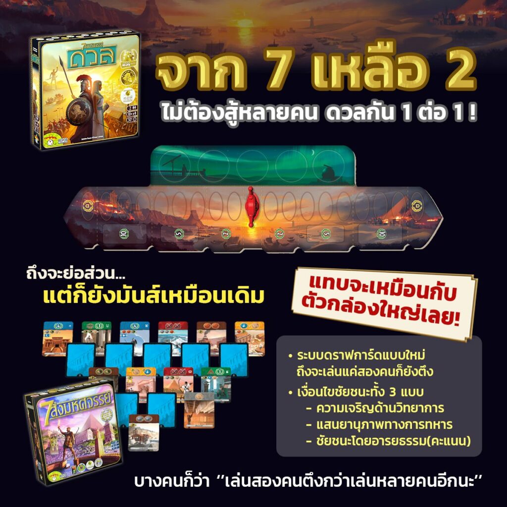 จากกล่องใหญ่ บอร์ดเกม 7 สิ่งมหัศจรรย์ มาเป็น 7 สิ่งมหัศจรรย์ ดวล ถึงจะย่อไซส์ลงแต่ความสนุกยังเหมือนเดิม เพราะ จากผู้เล่น 7 คน จะกลายมาเป็นการดวลกันแบบ 2 คนเท่านั้น ส่วนการเล่นจะคล้ายกับกล่องใหญ่เลย เพราะจะมีระบบการดราฟการ์ด และเงื่อนไขการชนะทั้งด้านวิทยาการ การทหาร และอารยธรรม