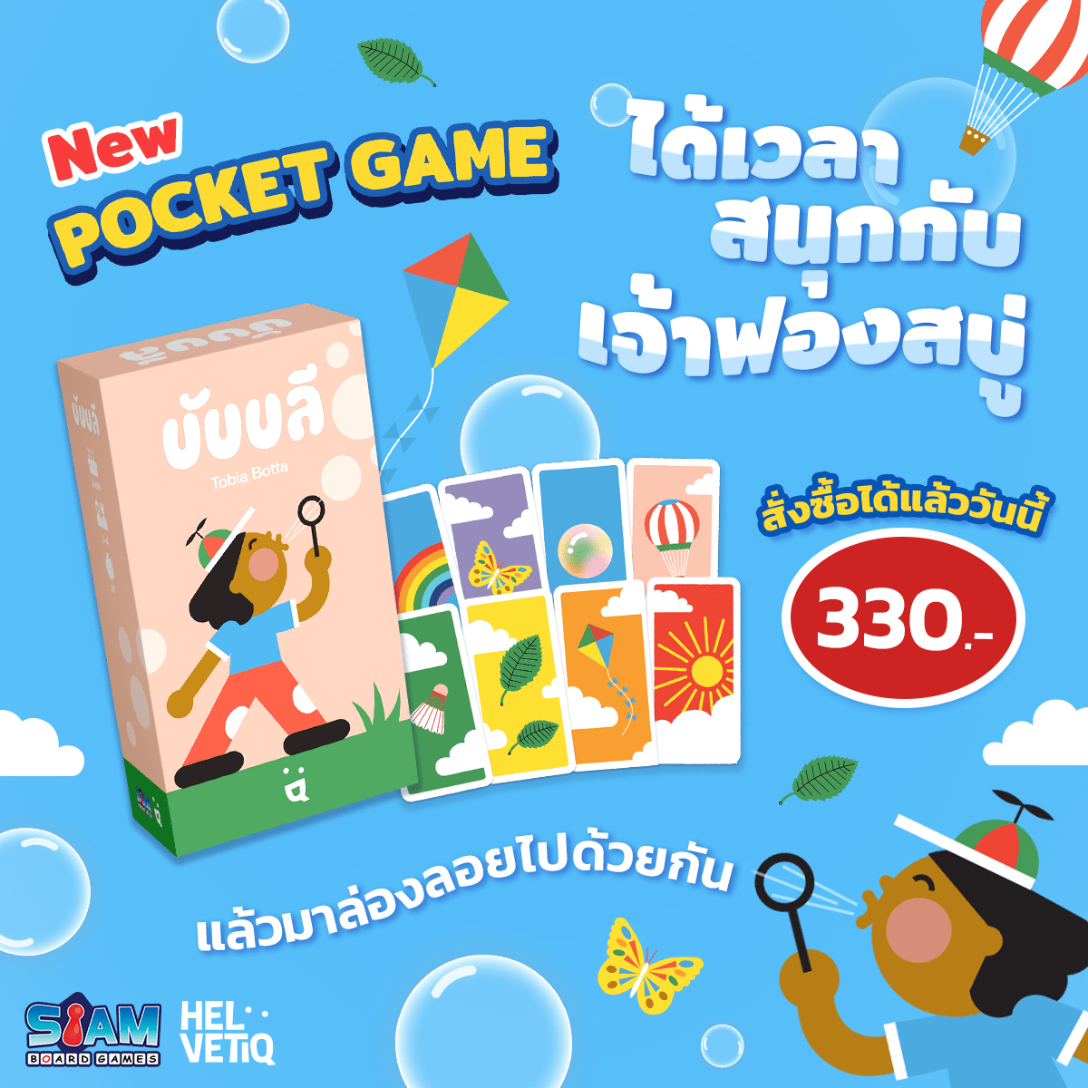 หลายคนคงได้เคยลองเล่น Pocket Game กันมาบ้างแล้ว วันนี้เราขอเสนอเกมใหม่ที่จะพาคุณออกไปสนุกด้วยกัน เกมนี้กติกาเล่นง่ายไม่ยุ่งยาก วิธีเล่นในแต่ละรอบจะแบ่งทีมฟองสบู่ 1 คน และคนที่เหลือจะเป็นทีมท้องฟ้า และผลัดกันเป็นฟองสบู่กันรอบละคน ทีมฟองสบู่จะต้องเป่าฟองสบู่ลอยให้ไกลที่สุด และคอยระวังทีมท้องฟ้าที่จะมีสิ่งของต่างๆ ลอยมาเพื่อขัดขวางไม่ให้ฟองสบู่ลอยไปได้ง่ายๆ โดยทีมท้องฟ้าเองก็ต้องวิเคราะห์ว่าในมือของทีมฟองสบู่นั้นมีการ์ดอะไรอยู่บ้างเพื่อจะขัดขวางและทำให้ฟองสบู่ไม่สามารถลอยไปได้